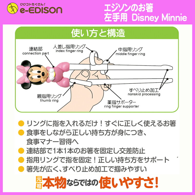 【左手用】お箸練習 エジソンのお箸左手用 ディズニーミニー(Minnie) トレーニング箸 カトラリー ポイント 子供用箸 すぐに正しく使える箸 トレーニング箸 しつけ箸 左利き 左利き応援グッズ!ディズニーミニー エジソンのお箸 左手用 ディズニー【Baby Minnie】がエジソンのお箸の仲間になりました。